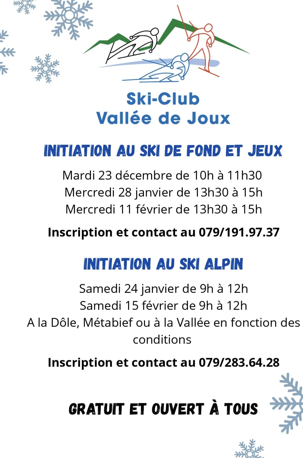 Pour le saut à ski, merci d’écrire à l’adresse mail ci-joint pour obtenir informations et dates!