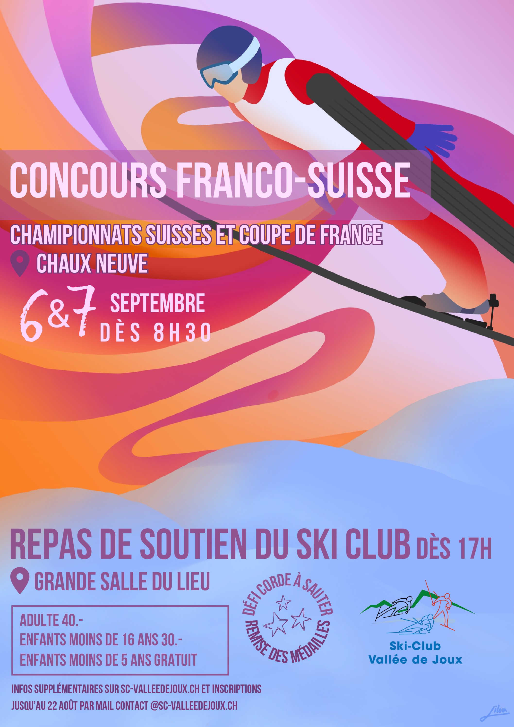 Nous aurons bien entendu besoin de bénévoles, tant aux tremplins à Chaux-Neuve (les 2 jours) qu’à la Vallée pour le repas et la fête du samedi soir, bloquez déjà la date dans vos agendas!